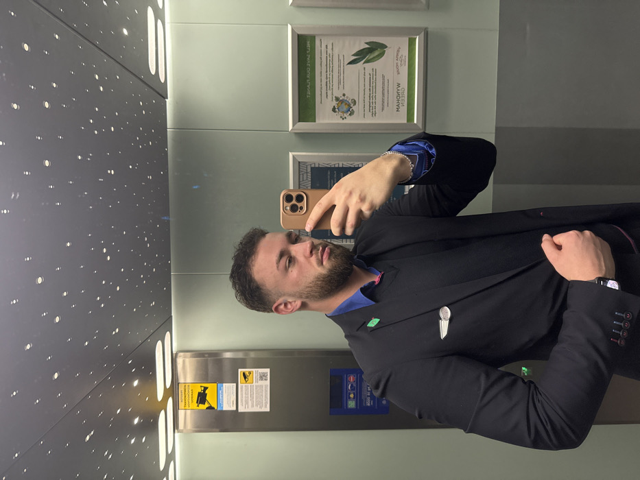 A male individual is depicted taking a mirror selfie inside an elevator. He possesses short dark hair, a trimmed beard, and is dressed in a dark blazer, a dark v-neck sweater, and a royal blue collared shirt with a visible pink collar line. A small green square pin and a silver-colored wing-shaped pin are affixed to the left lapel of his blazer. A silver-colored bracelet is present on his left wrist, and a dark-strapped watch on his right. He holds a light-colored smartphone in his right hand, positioned to capture his reflection. The elevator's interior walls are reflective, and the ceiling is dark, featuring numerous small, circular embedded lights. On the left side of the reflection, a metallic panel contains elevator controls and a yellow warning sign with black text indicating "VIDEOSORVEGLIANZA" (Video Surveillance) and two CCTV camera icons, along with a QR code and additional text in multiple languages. On the right side, two framed documents are visible. The rightmost document displays green-themed environmental information, including a stylized globe, leaves, and the mirrored, inverted text "WYNDHAM GREEN" at the bottom. This detail identifies the location as a Wyndham hotel in Bratislava, Slovakia. The male's expression is neutral, with his gaze directed at the smartphone.