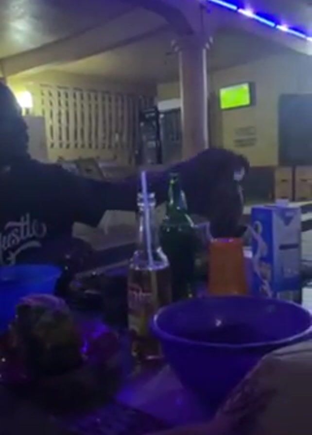 people sitting around a table in what appears to be an outdoor or semi-outdoor dining area, possibly a bar or restaurant. There are at least three adults and one young child visible. The table is cluttered with dishes, bowls, bottles of beer, and a carton of milk. The area is illuminated by overhead lighting, including blue LED strips. A TV is visible in the background, possibly showing a sports game. One person at the table is wearing a shirt with the word "Hustle" on it. One of the adults is holding a child on their lap. The overall atmosphere appears casual and relaxed.