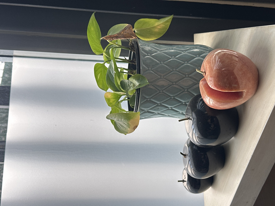 A plant in a textured blue pot sits on a white surface near a window. The plant has green and yellow leaves, some with brown edges. Next to the pot are three glossy black apple-shaped objects and one sliced peach or apple object made of orange marble. The objects are arranged on the white surface and appear to be decorative. The background shows a frosted window or a hazy outdoor scene.