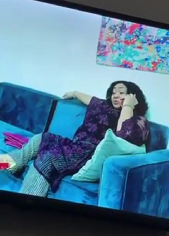 A television screen shows a woman talking on the phone. The woman has dark hair and is wearing a purple top with floral patterns and striped pants. She is reclining on a blue velvet couch with a white pillow. Behind her, there is a painting on the wall. The television screen is framed by a black border.