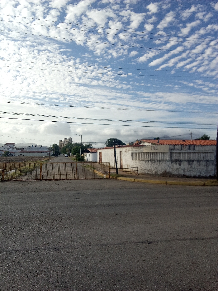 This image presents a street view in Pampatar, Venezuela, under a sky densely populated with white, rippled altocumulus clouds