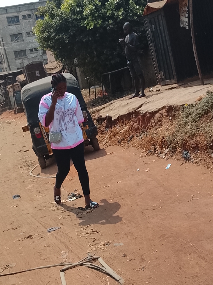 The image captures an outdoor street scene in Onitsha, Nigeria, under bright daylight. In the foreground, a woman with dark braided hair, dressed in a white and pink tie-dye oversized t-shirt, black leggings, and striped slide sandals, walks on a reddish-brown dirt road. She holds a dark smartphone to her right ear, appearing to be in conversation. A small, light-colored crossbody bag is worn across her body. To her left, a dark-canopied three-wheeled auto-rickshaw is partially visible. To the right of the road, on an elevated, eroded dirt embankment, a man stands still, viewing a device in his hands. He wears a dark t-shirt, shorts, and flip-flops. Behind the man is a dark, rectangular kiosk with an overhead canopy, partially obscured by green foliage. In the far left background, a weathered, multi-story concrete building with multiple windows is visible. The dirt road surface displays tire tracks and scattered debris. Strong overhead sunlight casts distinct shadows.