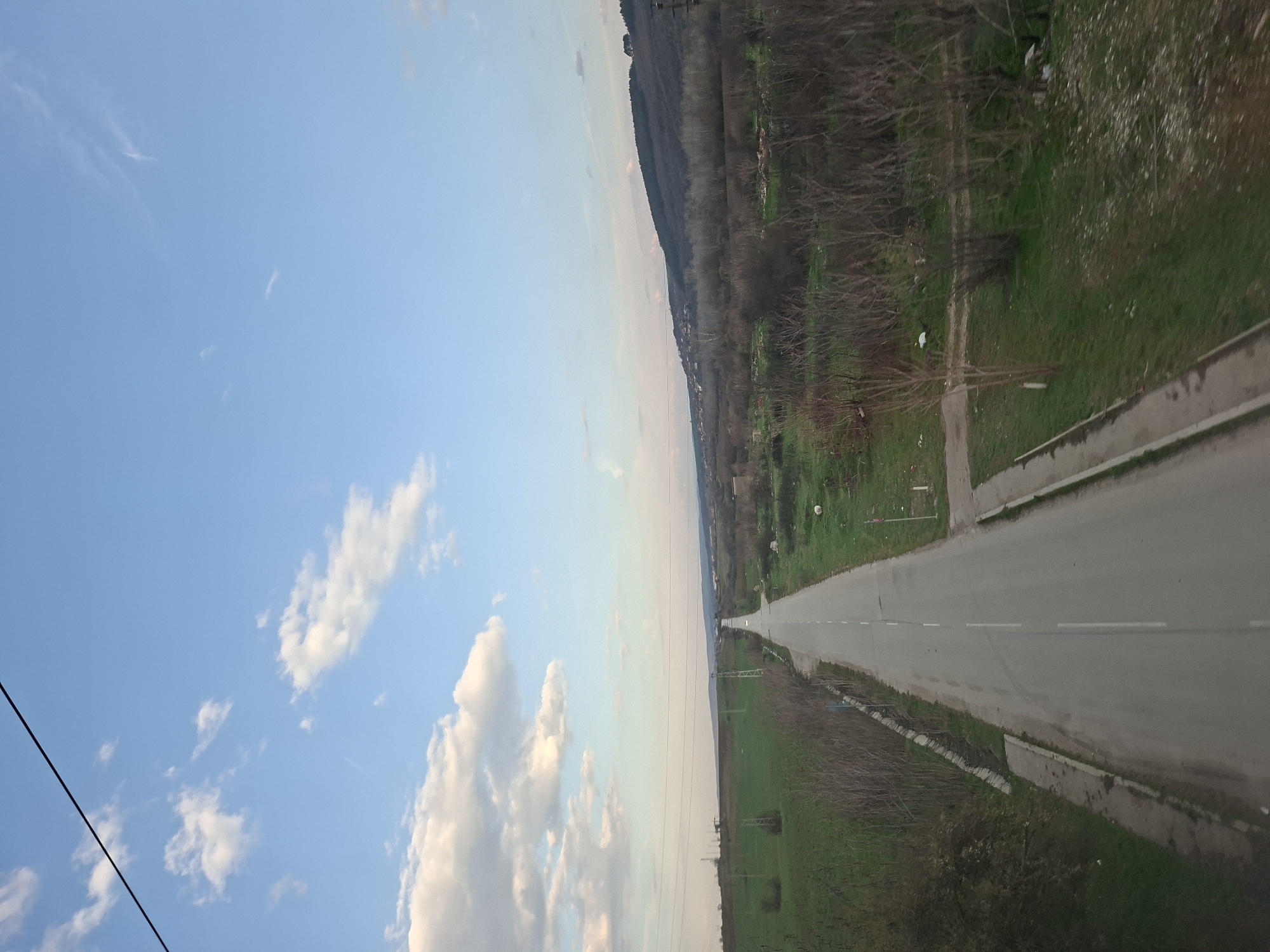 The image depicts an elevated view of a two-lane asphalt road extending straight into the distance, receding towards a distant horizon. The location is Unknown, Unknown. **Environment:** The scene is rural or semi-rural, captured under a partly cloudy, light blue sky with scattered white cumulus clouds. A dark, thin linear object, possibly a power line, traverses the upper sky from left to right. The lighting suggests late afternoon or early evening, with a faint pinkish-yellow hue near the horizon. **Road:** The gray asphalt road occupies the central lower portion of the image, marked by a continuous white line in the center and dashed white lines defining two lanes. No vehicles or pedestrians are present on the road. Concrete or paved shoulders flank both sides of the road. **Left Side of Road:** To the left of the road, a green field, possibly agricultural, extends outwards. Several utility poles with power lines are visible in the mid-ground. The immediate roadside features a concrete or stone drainage ditch, beyond which are bare, deciduous shrubs and trees. A distant settlement or village is visible on the far left horizon, situated against a backdrop of hills. **Right Side of Road:** To the right of the road, the ground is covered in green grass interspersed with patches of bare earth and discarded white material, possibly debris or plastic bags. A small, light-colored object is visible on the grass in the mid-ground. Bare, deciduous trees and shrubs line this side as well. Further into the background, a large metal utility pylon/tower is present. **Background:** The distant horizon is marked by a series of rolling hills. The hills on the right are densely covered with dark, bare trees, forming a visible forest. A small cluster of evergreen trees is distinguishable on the crest of the rightmost hill. The overall landscape suggests early spring or late autumn due to the prevalence of bare deciduous vegetation. No human figures or discernible animals are visible.