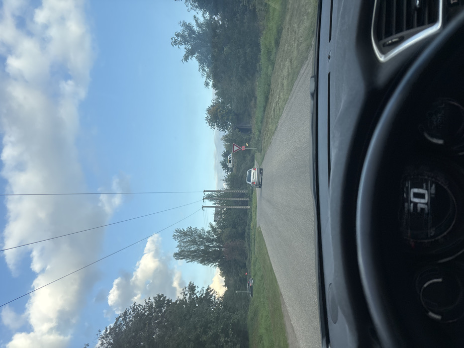 The image depicts a forward-facing view from the interior of a vehicle on a paved road in Scherwiller, France. The vehicle's dark dashboard and steering wheel occupy the lower foreground, with a digital display showing "50." The asphalt road extends into the midground, gently curving to the left. A light-colored station wagon or hatchback is visible driving away from the viewer in the middle of the road. To the right of the road, a red and white 'Give Way' (yield) sign is prominently displayed. Overhead, multiple power lines stretch across a blue sky with scattered white cumulus clouds. These lines are supported by several utility poles, visible further down the road, constructed of concrete or metal. Extensive green foliage and trees line both sides of the road, forming a dense natural border. On the left side of the road, off the pavement in a grassy area, a dark vehicle is partially obscured. In the distant background to the right, a white recreational vehicle (camper van) is visible on what appears to be a raised embankment. No individuals are depicted.