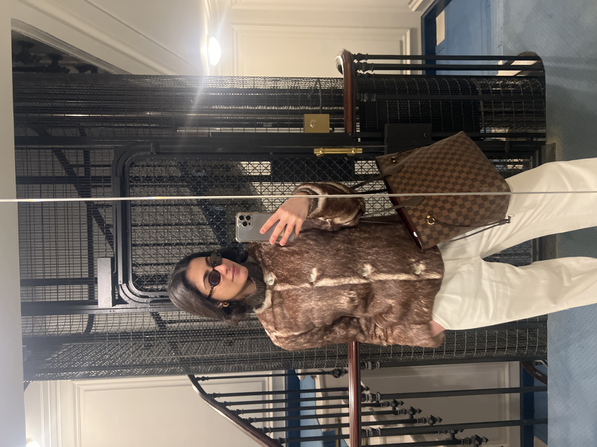 A woman is captured in a mirror reflection, standing in a hallway of a Parisian building. She has dark hair and wears dark oval sunglasses, a brown fur-textured coat over a dark turtleneck, and white trousers. Her left hand is in a trouser pocket, while her right hand holds a silver smartphone, capturing the reflection. A brown checkered tote bag is slung over her left shoulder. Behind her is a traditional open-cage elevator with a black metal grid door and framework, featuring a brass handle and latch. To her left, an ornate staircase with dark metal balusters and a polished dark wood handrail curves upwards. The hallway features light-colored paneled walls, a blue-grey carpeted floor, and overhead ceiling lights. The architectural elements, including the classic elevator and staircase, are characteristic of older apartment buildings in Paris, France.