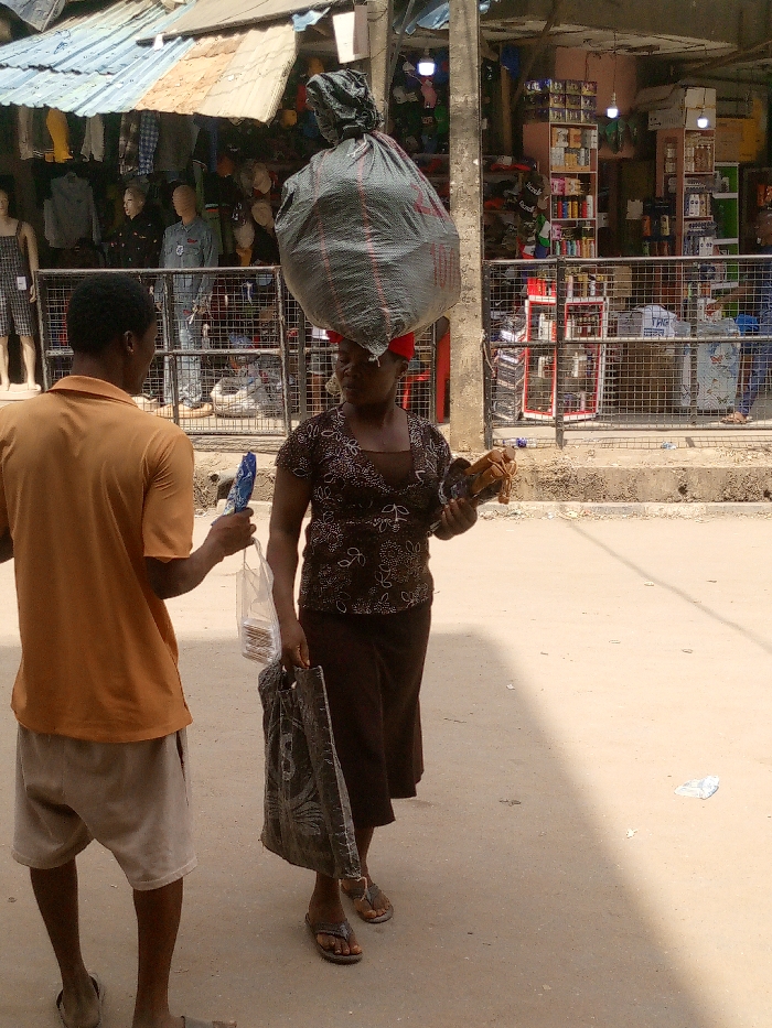 The image depicts a daytime street scene in Fegge, Nigeria. An adult female, positioned centrally, balances a large, grey woven sack on her head. She wears a dark, patterned short-sleeved top, a dark skirt, and dark flip-flops. She holds a brown object in her right hand and a dark bag containing a clear plastic bag with items in her left hand. An adult male stands to her left, facing her. He wears an orange polo shirt, light shorts, and dark flip-flops. He holds a clear plastic bag with rectangular packaged items in his left hand and a blue wrapped item in his right hand. The ground is light-colored dirt. In the background, beyond a concrete curb and metal barrier, are multiple storefronts. The left storefront displays clothing on mannequins under a corrugated metal roof. The right storefront shows shelves stocked with packaged goods, illuminated by exposed lightbulbs.