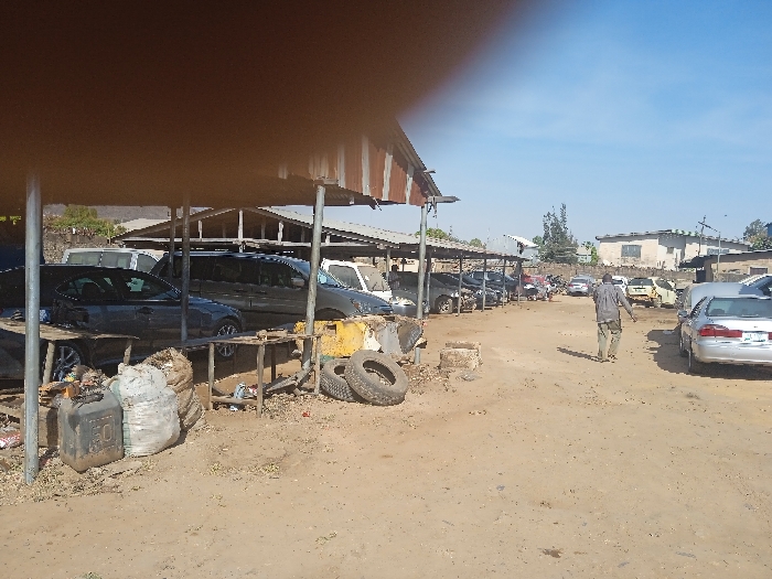 This image depicts an outdoor auto repair or salvage yard located in New Stadium, Nigeria, under a clear blue sky
