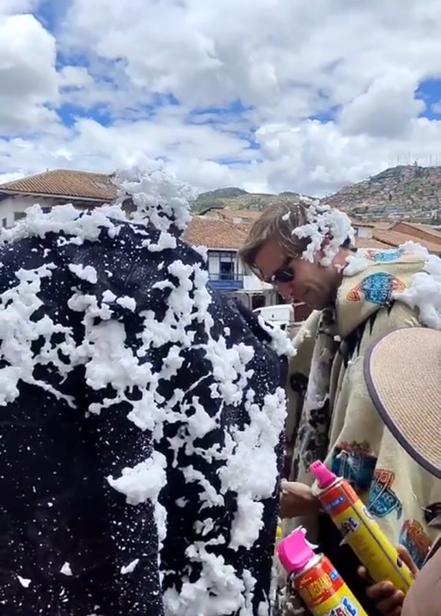two men being sprayed with artificial snow on a sunny day with scattered clouds. Both men are covered in the white foam, especially on their hair and shoulders. The man on the left is wearing a dark patterned jacket, while the man on the right has sunglasses and a light-colored patterned poncho. People are standing around them, some holding cans of the artificial snow spray. In the background are buildings with red-tiled roofs and a hillside with houses. The cans used to spray the foam are yellow and pink and labeled "Nieve artificial." The men appear to be participating in a festive activity.