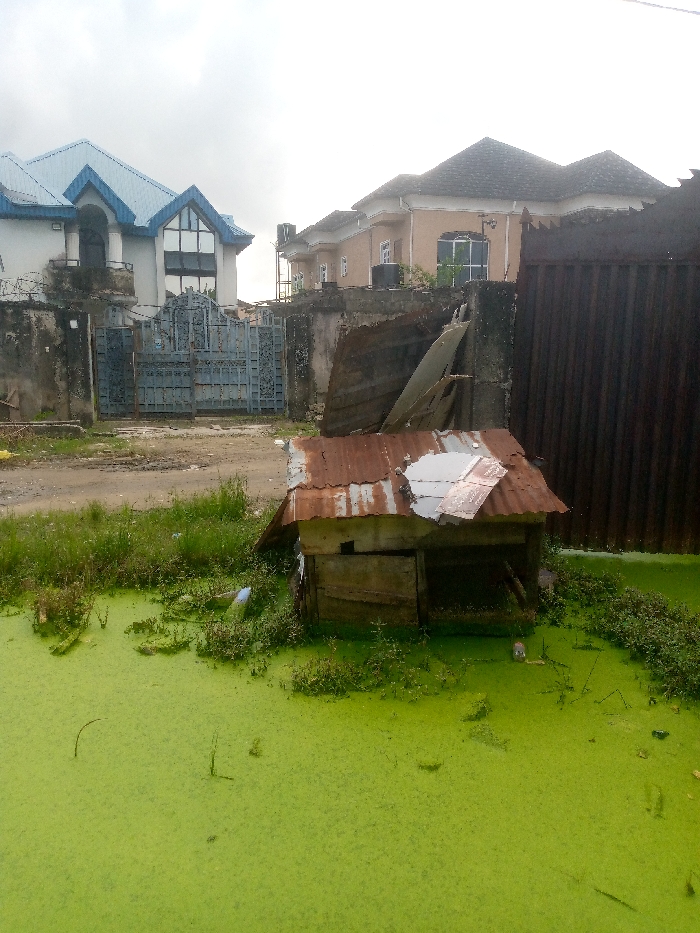 The scene is an exterior view in Badore, Nigeria, under an overcast sky. In the immediate foreground, a body of stagnant water is entirely covered by a dense layer of bright green duckweed or algae, interspersed with emergent green vegetation and visible debris, including plastic. Partially submerged in this water is a small, dilapidated rectangular structure constructed from unpainted wooden planks, featuring a pitched roof made of heavily rusted and partially damaged corrugated metal sheets. A strip of bare earth, appearing as a dirt road or path, separates the green water from a large, ornate grey metal gate in the midground. Beyond this gate and a concrete perimeter wall, a modern, multi-story white house with a prominent light blue gabled roof and large dark-framed windows is visible on the left. Barbed wire is affixed to the top of the wall in front of this residence. To the right, another multi-story house with light-colored walls and a dark, multi-pitched roof is partially obscured behind a concrete wall and a tall, dark corrugated metal fence. Water storage tanks are observed on the roofline of the house on the right. No human subjects are present in the image.