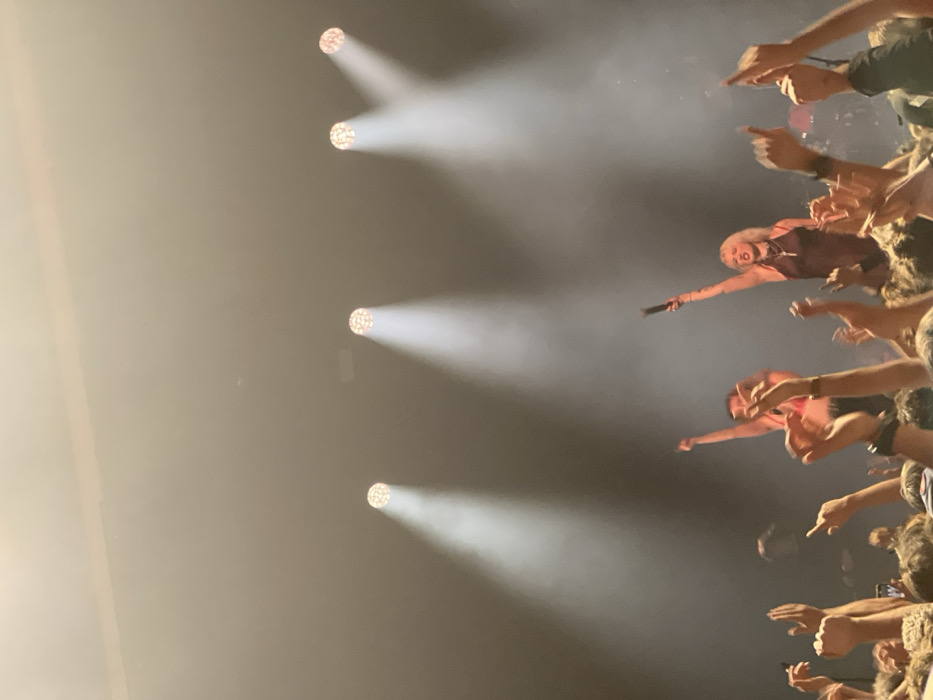A crowd of people at a concert with their arms raised towards the stage. The artist, with blonde hair and wearing a dark top, is crowdsurfing and holding a microphone. Stage lights shine down on the crowd, creating a hazy atmosphere. Many hands are pointing and reaching towards the performer. The scene is energetic and dynamic.