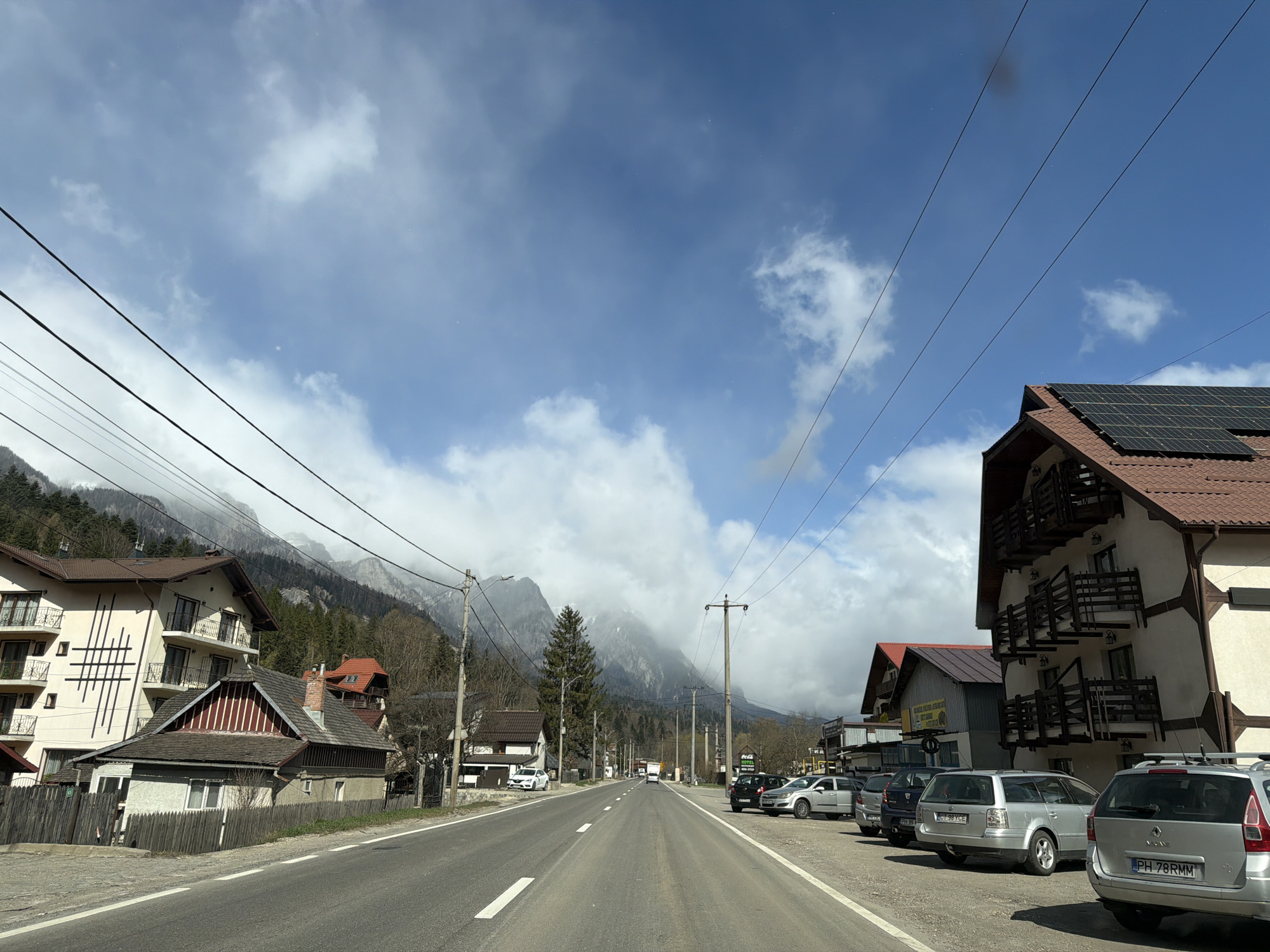 straight road in Sinaia, Romania. The road is asphalt with a white line dividing it in half. Buildings line both sides of the road, ranging from houses to larger structures with balconies. Many cars are parked on the right side of the road. Power lines stretch across the sky above the road. In the background are mountains partly obscured by clouds. The sky is blue with white clouds. Solar panels are visible on the roof of one of the buildings.