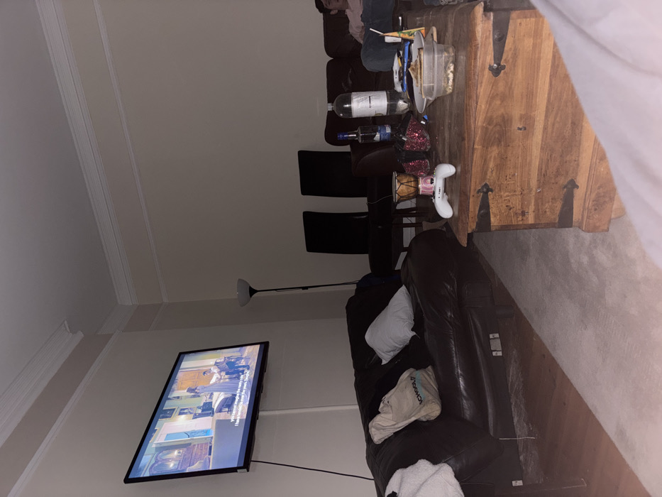 This image depicts an indoor residential living room in Newcastle upon Tyne, United Kingdom, observed in dim, likely evening, ambient lighting. The room features light-colored, plain walls and a white ceiling with decorative coving. The flooring consists of wooden planks around the perimeter, with a light-colored area rug centrally positioned. On the left, a dark brown leather three-seater sofa is arranged parallel to the wall. A white fluffy blanket is draped over its left armrest, and a light-colored canvas tote bag with "SCHOOL" partially visible, along with a white pillow, rests on the cushions. On the wall above this sofa, a flat-screen television is mounted. It displays an animated scene featuring two figures and English subtitles, which read: "You won't imagine the nasty time I have had [text obscured] over the years, though". In the background, two dark, high-backed chairs are visible against the far wall. A tall, dark floor lamp with a white, inverted cone-shaped shade stands in the corner between the television wall and the far wall. On the right, a section of another dark brown leather sofa is partially visible. One individual is reclining on this sofa, wearing a light pink shirt and blue jeans, partially obscured from view, and appears to be observing the television. In the foreground, a rustic wooden chest-style coffee table with dark metal hinges occupies the center of the rug. Upon this table are various items: a white PlayStation controller, a small decorative bongo drum on a pink stand, a cluster of red glittery decorative objects, a large clear plastic bottle (likely water), a blue bottle (possibly spirits), a mobile phone, a clear plastic container holding what appears to be peanuts or similar snacks, a sandwich cut in half on a small plate, a small orange juice carton with a straw, and a white disposable plate with remnants.