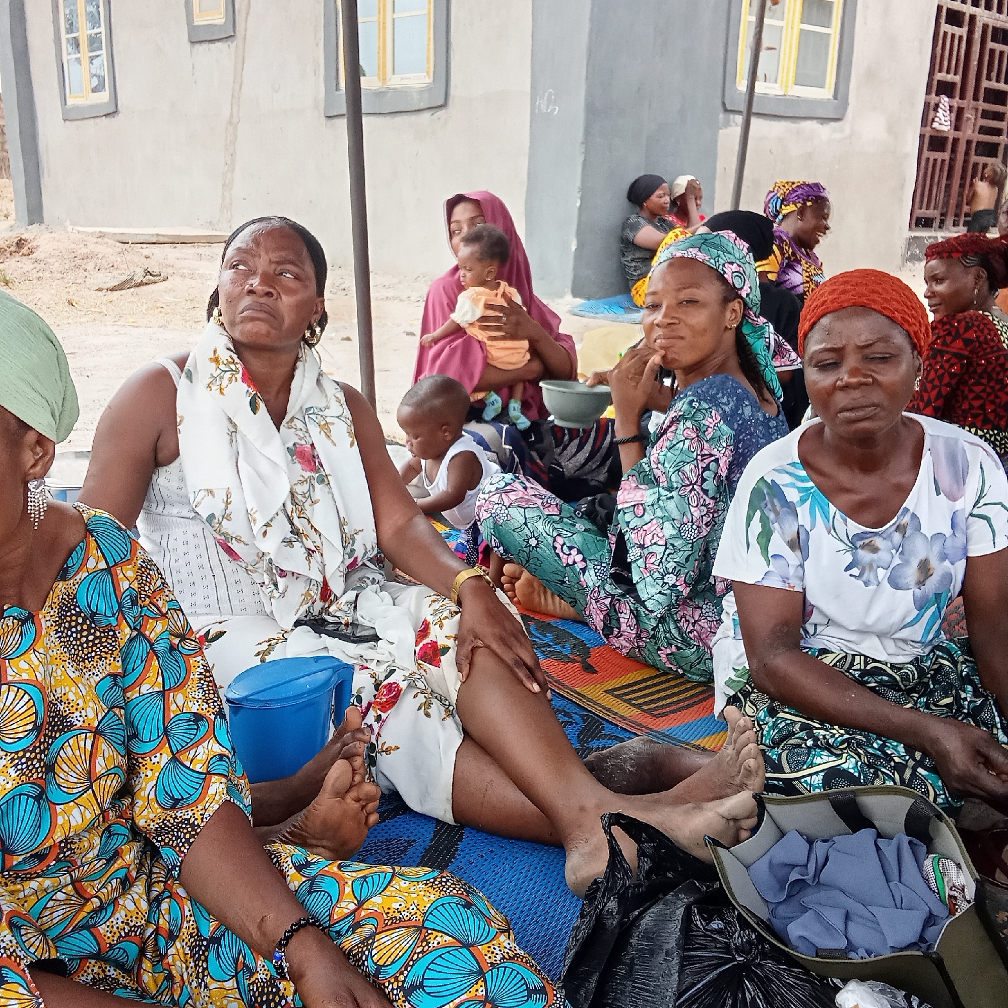 In Doma, Nigeria, a group of women and children are sitting on mats. The adults wear brightly colored and patterned clothing, and some have head coverings. A baby sits amongst them in a white onesie. A woman in a pink headscarf holds a baby. The background shows a building with windows. A blue plastic container and a bowl are also visible.