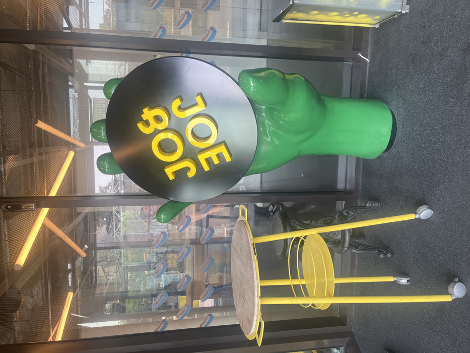 An outdoor scene captured at a Jo&Joe establishment in Gentilly, France, displays a large, vivid green stylized sculpture of a human hand holding a circular black sign. The sign features the yellow text "JO & JOE" oriented vertically. To the left of the sculpture stands a yellow mobile table with a round wooden top and a lower circular shelf, supported by four legs ending in grey casters. The ground in the foreground is covered by a dark, flat surface, likely a mat or carpet. Behind these objects, a glass facade reveals the building's interior. Reflected on the glass are multiple repeating patterns of stylized hotdogs with blue buns. Inside, a dark, ornate stool is visible, along with horizontal linear light fixtures on the ceiling. A partial reflection of an individual, showing dark pants and white sneakers, is visible on the glass to the left of the green hand sculpture. No explicit actions or interactions are occurring; the scene is static.