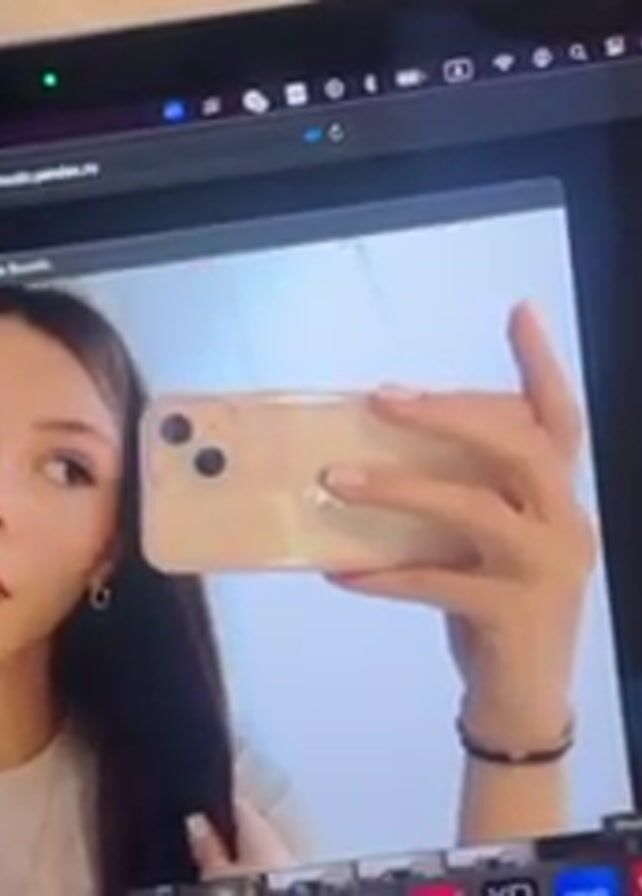 A video shows a screen capture of a Macbook laptop displaying a selfie video of a young woman with long dark hair wearing a grey t-shirt and taking a selfie with a light-colored iPhone