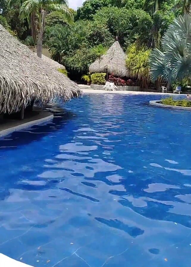 bright blue swimming pool with a rough, tiled bottom. The pool is surrounded by a wide white concrete border and a textured gray tiled walkway. Tropical vegetation, including palm trees and thatched roof structures, surrounds the pool area. Several people are in the pool, relaxing and interacting with each other. The lighting is bright, suggesting a sunny day. The camera pans slowly, capturing the expanse of the pool and its tropical surroundings.