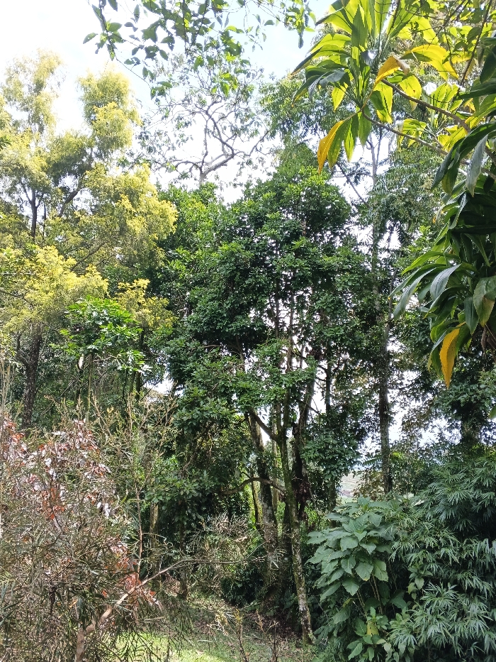 This image depicts a dense, verdant natural environment within the city of Unknown, Vietnam. The scene is dominated by a variety of trees and lush foliage under a bright, diffused sky. In the foreground, lower left, is a bush with sparse, reddish-brown leaves and branches. To its right, a cluster of broad-leafed plants with dark green foliage is visible. The midground and background consist of numerous trees of varying heights and leaf densities. A prominent tree in the center features dense, dark green leaves, with its trunk partially visible. To the left, trees with lighter, yellowish-green leaves stand out against the sky. Scattered throughout the frame are additional trees with dark green canopies and visible trunks, some appearing bare or sparsely branched in the upper center. No people, animals, or man-made structures are present. The overall impression is a vibrant, undisturbed tropical or subtropical forest section.