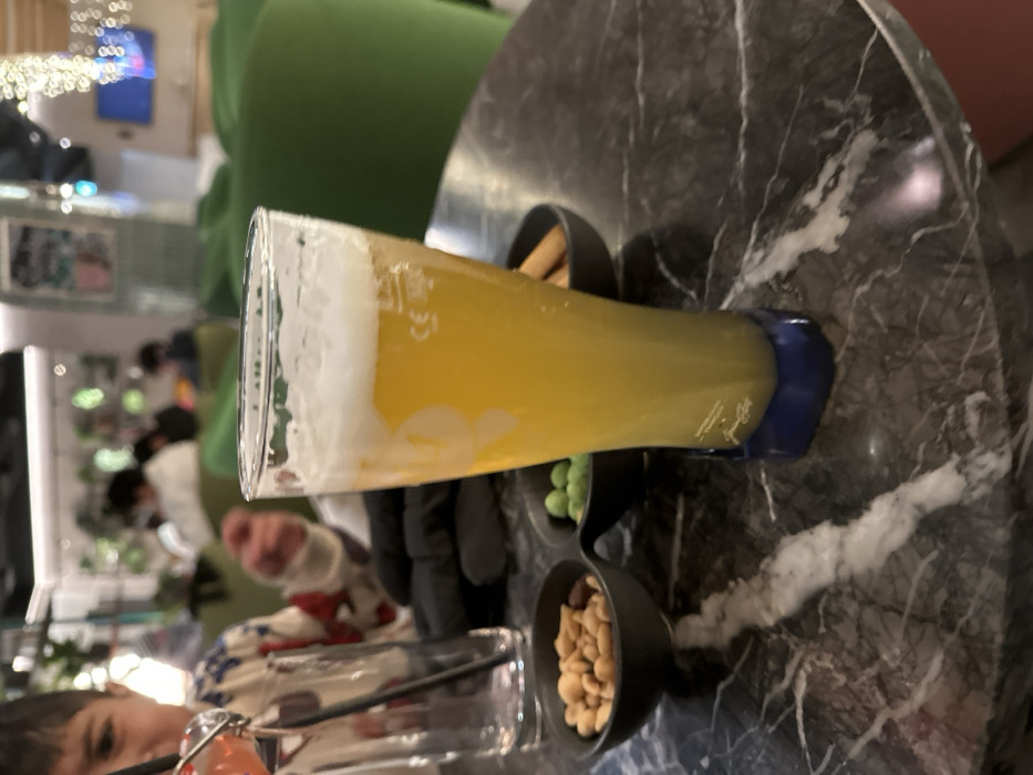 A glass of beer with a frothy head sits on a marble-patterned table. A black serving dish containing nuts and other snacks is beside the glass. In the blurry background, people are seated in a restaurant or bar area. Another drink with a straw is partially visible. The overall setting suggests a casual dining or social gathering atmosphere.