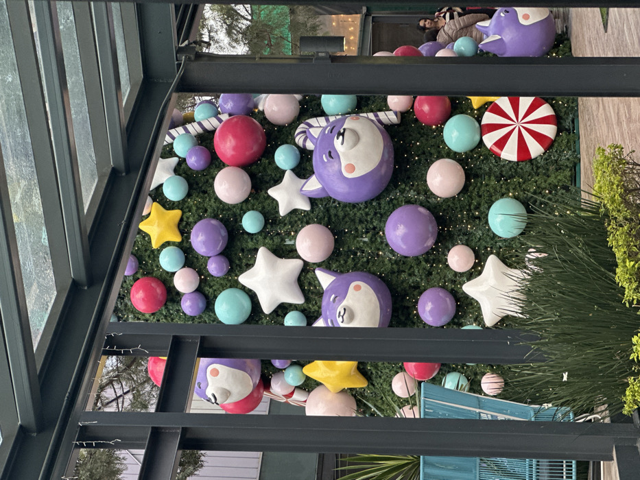 A whimsically decorated Christmas tree features colorful ornaments like pink, purple, and turquoise balls, white stars, and cartoonish animal heads. The tree is adorned with subtle twinkling lights, adding a magical ambiance. The view is framed by a black metal structure, providing an architectural context to the festive display. Lush green foliage adds a natural touch to the scene's right side. Above the tree, two people sit.