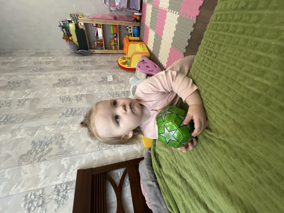 A toddler lies on a green, textured blanket, clutching a green soccer ball adorned with silver stars. The child wears a light pink shirt. Beside the bed is a dark wood headboard. The room includes a wall with a cloud-patterned wallpaper. In the background, there's a colorful play area with toys and puzzle mats.