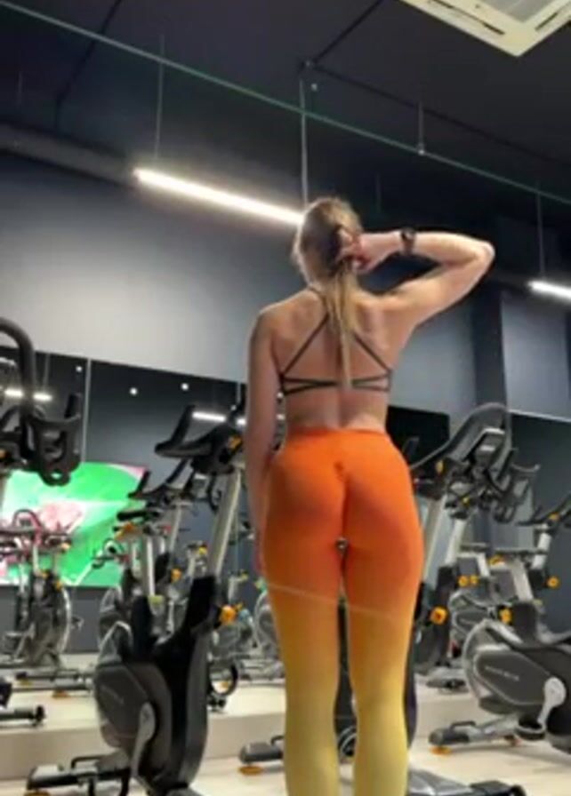 A woman stands in a gym, facing away from the camera. She is wearing a dark gray sports bra and orange-to-yellow gradient leggings. Her hair is tied back in a ponytail. She is in a gym with exercise bikes visible, and there are mirrors on the wall. She moves her arms, appearing to stretch. There are overhead lights and a ventilation system visible on the ceiling.