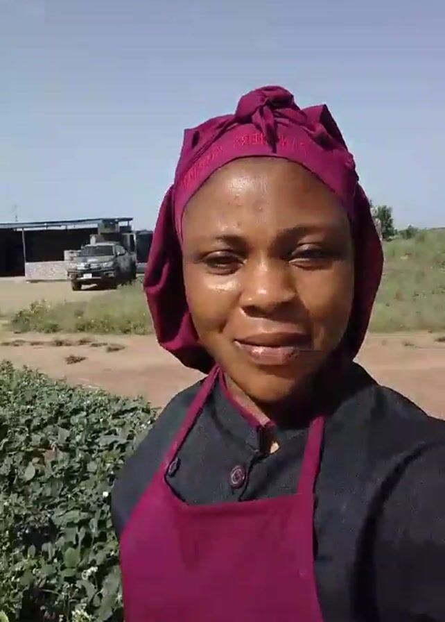 woman standing outdoors. She is wearing a dark gray top with buttons, a maroon apron, and a maroon head covering. She smiles at the camera. The background appears to be a rural or agricultural area with a dirt road, green vegetation, and a building in the distance. The sky is blue with some clouds.