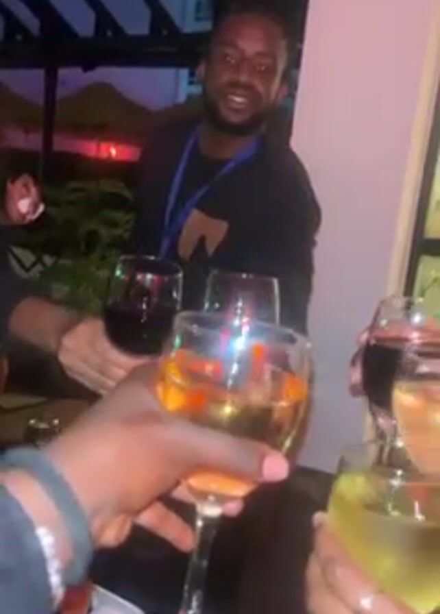 Several people are toasting with wine glasses on a covered patio at night. Some glasses hold red wine, others contain a lighter-colored wine. A man standing behind the table appears to lead the toast. The patio has a dark-colored table and chairs, with a glimpse of greenery and soft lighting in the background. The atmosphere suggests a casual celebration or gathering.