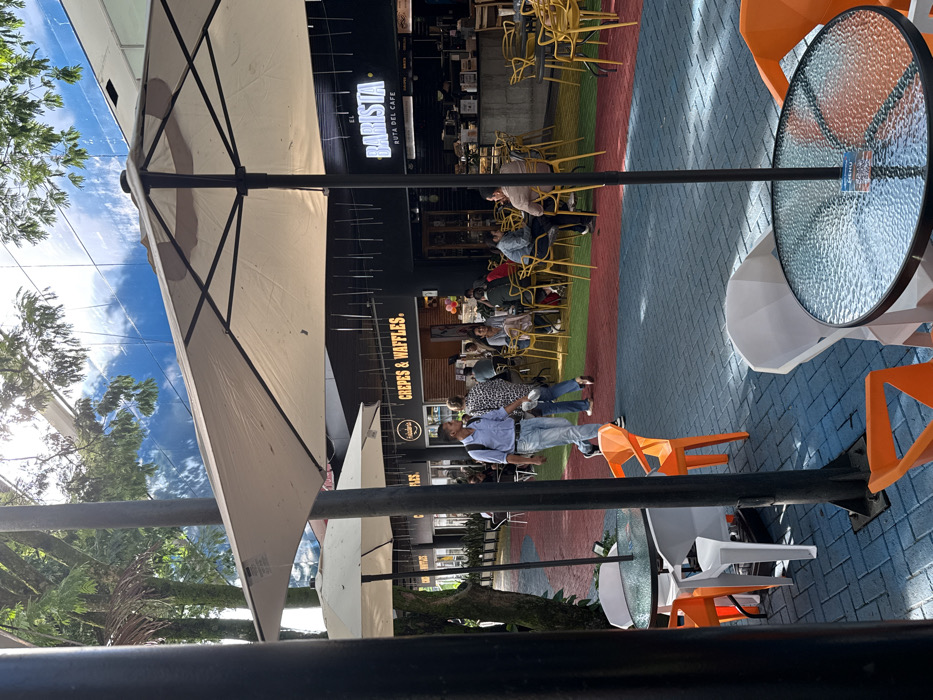 The image depicts an outdoor commercial pedestrian area in Perimetro Urbano Pereira, Colombia, under daylight. The ground is paved with interlocking pavers in sections of blue, red, and green. In the immediate foreground, a circular glass-top table is flanked by an orange and a white chair, with a large, light-colored umbrella positioned centrally. Another similar umbrella is visible to the left. In the mid-ground, a male subject wearing a light blue collared shirt, light blue jeans, and a dark backpack walks from left to right. He is followed by a female subject in a patterned top and light-colored pants. Beyond them, two establishments feature black facades with illuminated signage: "CREPES & WAFFLES." is on the left, and "EL BARISTA RUTA DEL CAFE" is on the right, displaying an open entrance and visible counter area. Approximately ten individuals are seated at yellow outdoor tables and chairs arranged in front of "EL BARISTA RUTA DEL CAFE," engaged in social interaction. Additional people are partially visible near the "CREPES & WAFFLES." store. Above the storefronts, a modern building with a reflective blue glass facade is visible, mirroring the sky and surrounding trees. Green foliage from trees is present on the left and upper portions of the frame, contributing to the outdoor ambiance.