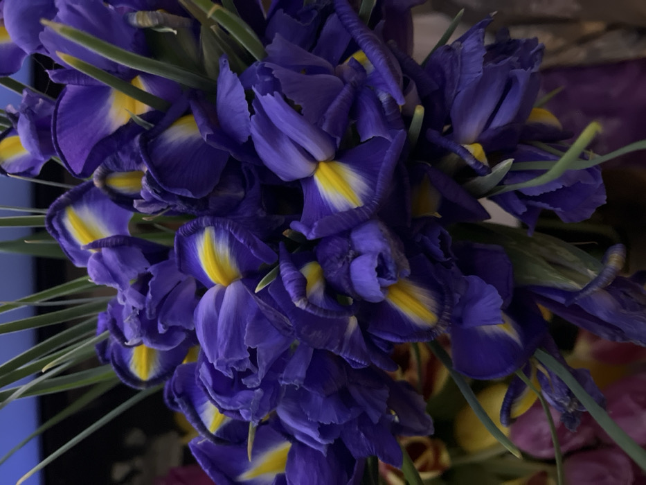 - "The image displays a densely packed bouquet of numerous purple irises, each featuring distinct yellow and white markings on its lower petals" by FM-KniOR2, licensed under CC BY 4.0