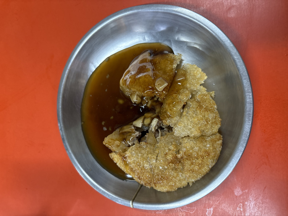 - "A golden-brown, deep-fried Taiwanese Ba-wan (肉圓), partially split open, rests within a shallow, circular metallic bowl" by FM-bmo3E3, licensed under CC BY 4.0