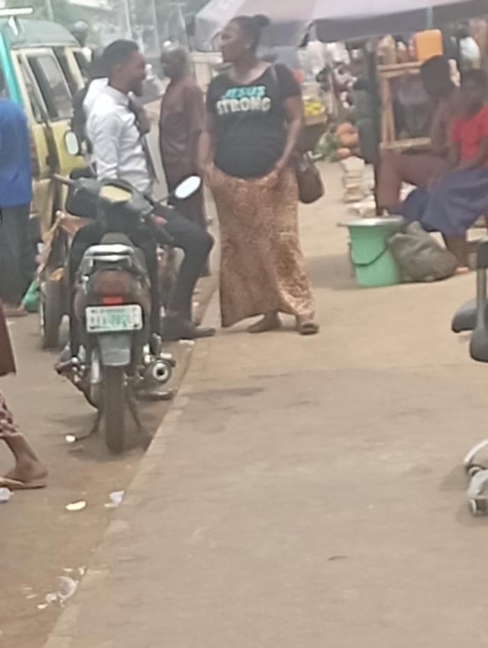 This image depicts a bustling outdoor scene on a paved street in Maiburiji, Nigeria, likely a market area, under overcast daylight conditions. In the center-left foreground, a male individual with dark hair and a light complexion is seated on a dark-colored motorcycle. He wears a white long-sleeved collared shirt and dark trousers, facing towards the right with a visible smile. The motorcycle's rear license plate is partially visible, showing "KAA-708CU". Immediately to the right of the motorcycle, a female individual with dark skin and dark hair tied back stands, facing generally right. She wears a black t-shirt with "JESUS IS STRONG" printed in green text on the front and a long, light brown patterned skirt, with a dark brown shoulder bag on her left side. Behind these two figures, a male individual with darker skin and an older appearance stands, wearing a brown traditional garment. Further left, a person in a blue shirt is partially visible. On the far right, two individuals are seated on low stools or benches behind a rustic wooden market stall displaying various items, including produce and bottles. One person wears a red shirt, and the other wears a blue garment. A light green bucket and a grey bag are positioned on the ground near their feet. An umbrella or canopy structure partially covers the market stall area. In the background on the far left, a light yellow/tan van is partially visible. The ground is a light-colored paved surface, with scattered litter, including small white debris and plastic, evident in the immediate foreground. Distant background elements are blurred, suggesting other structures and foliage.