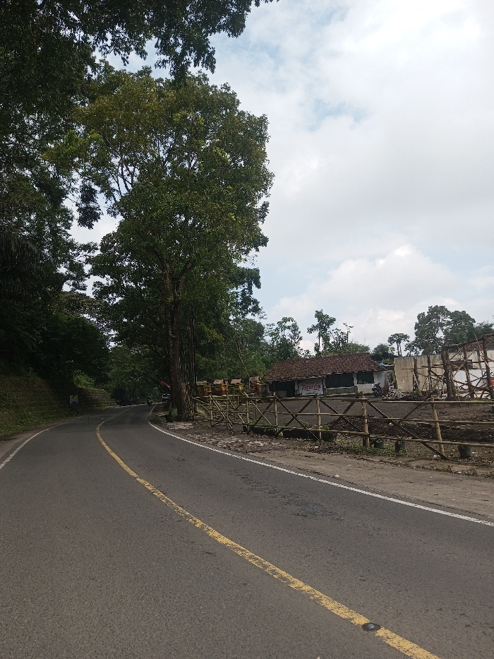 A winding asphalt road with a yellow center line curves left. Lush green trees line the road's edge. On the right, a rustic wooden fence encloses a building with a red tile roof and the word "Aminia" visible on its facade. Beyond the building are construction materials and sparse vegetation, under a cloudy sky.