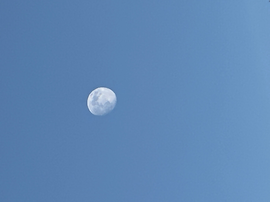 A medium, slightly soft-focus image depicts a nearly full moon against a clear, light-blue daytime sky