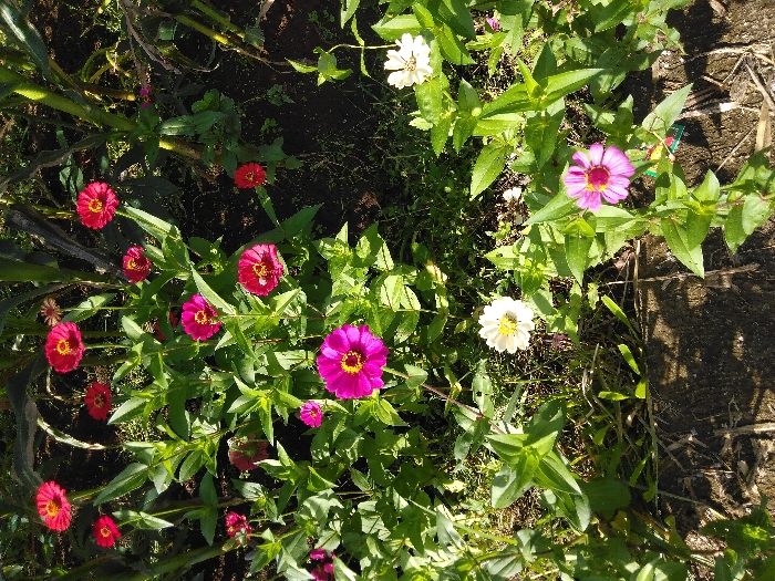 This image displays a cultivated garden patch in Ban Naduan, Laos, under bright daylight conditions. The scene is dominated by numerous Zinnia flowers, primarily in shades of fuchsia, deep red, and white, each featuring a prominent yellow or orange central disc. These flowers are in various stages of bloom and are densely interspersed among their vibrant green leaves and stems. The ground visible beneath the foliage consists of dark, moist soil, with some scattered dried plant debris and sparse green weeds. A dark, irregular band, possibly a concrete or stone border, is present along the bottom edge of the frame. Taller green stalks, consistent with corn plants, are partially visible in the background. No human figures or animals are present in the depicted environment.