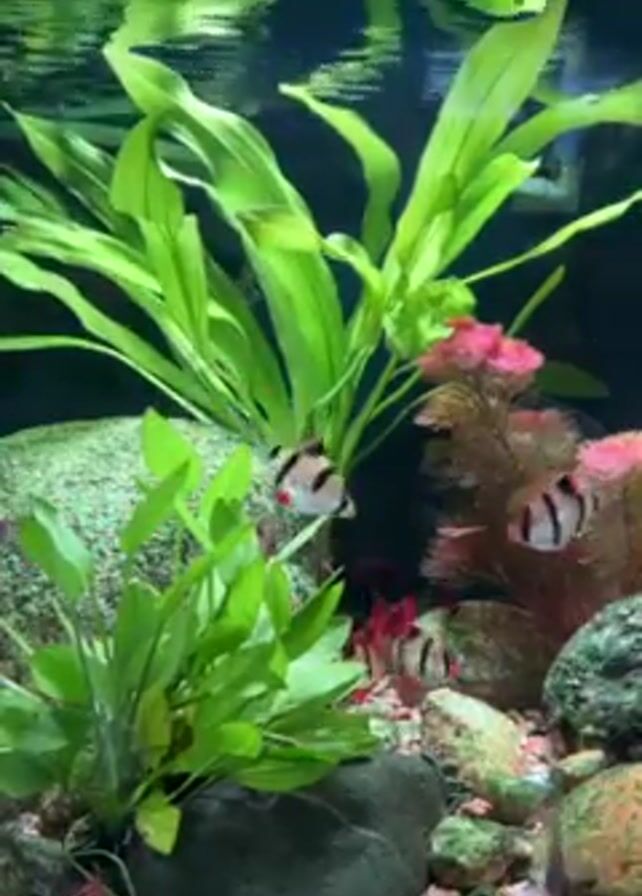 n aquarium with several fish swimming amongst the plants and rocks. There are two distinct types of fish: one is silver with black stripes and a reddish nose, and the other is red. The aquarium is decorated with green plants, rocks covered in green moss, and a reddish-brown artificial plant. The substrate of the aquarium appears to be small, multicolored gravel. The water is clear, and a reflection of the light source can be seen on the surface.