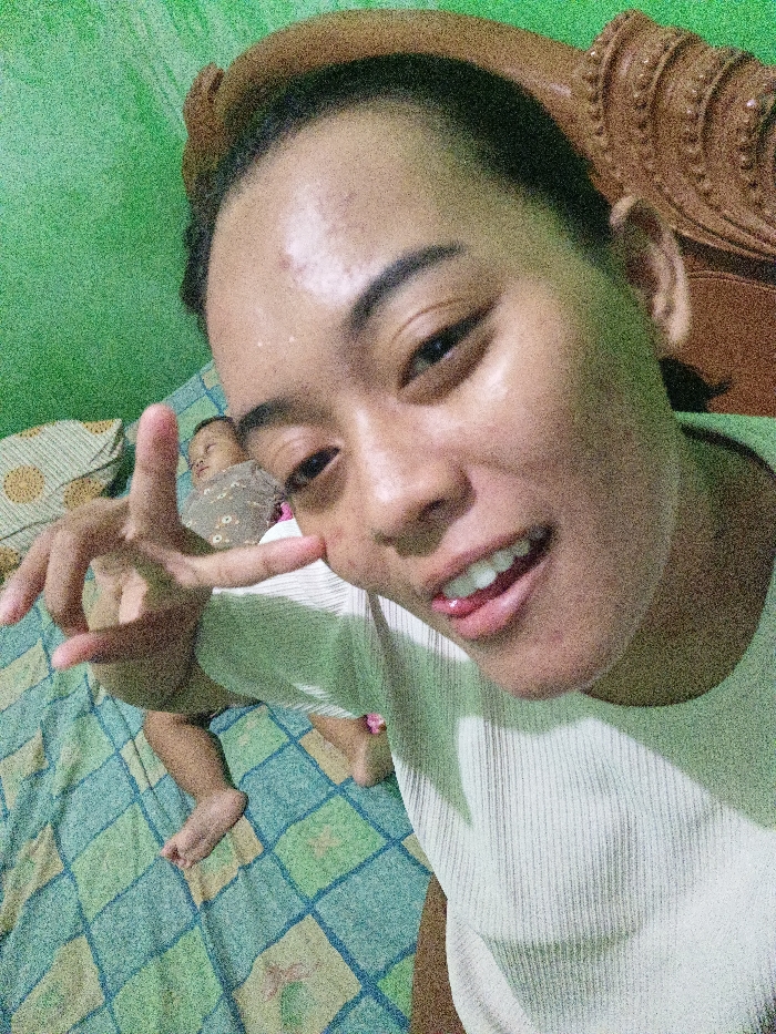 An indoor close-up image, purportedly from Kecamatan Pati, Indonesia, features a young adult female in the foreground and an infant in the midground