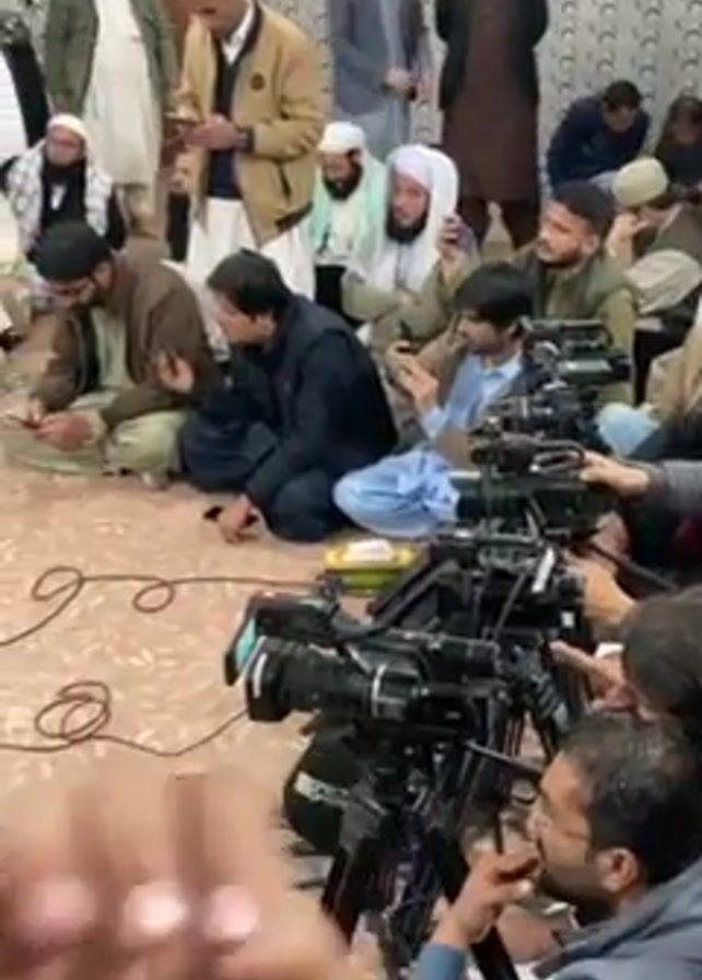 room where numerous men are seated on the floor. They appear to be engaged in some sort of gathering or meeting. In the foreground, there are several professional video cameras set up on tripods, along with a tangle of cables and wires on the carpeted floor. Many of the men are looking towards the cameras and microphones placed in front of them, suggesting they are preparing for or participating in an official statement or press conference. In the background, a poster with text in Arabic and possibly Urdu, alongside a black and white flag, indicates the event may be associated with a political or religious organization. The atmosphere seems formal, with most men wearing traditional attire or business casual clothing. Some men are looking at their phones, awaiting for the event to begin.