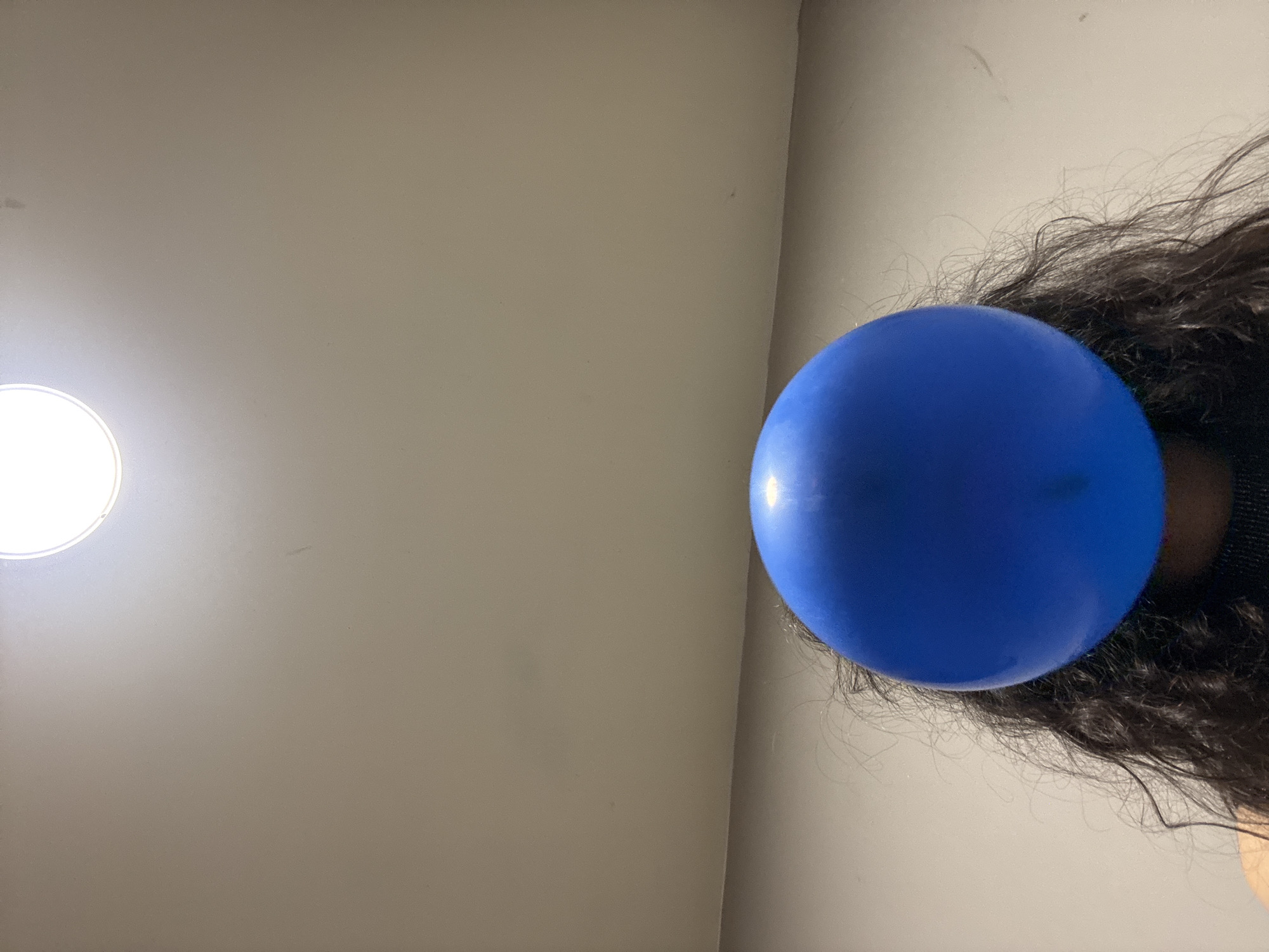 A blue balloon is positioned in front of a person's dark, curly hair