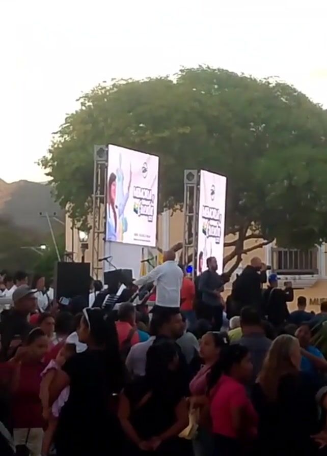 daytime outdoor event with a crowd of people gathered in front of a stage with two large video screens. The screens display a poster with a woman's image and the words "MEMORIA CULTURAL." Some people are standing on the stage, appearing to speak or perform. A large tree is behind the stage, partially obscuring a building. Mountains are visible in the distance. The crowd seems to be watching the stage, and some individuals are possibly interacting with each other.