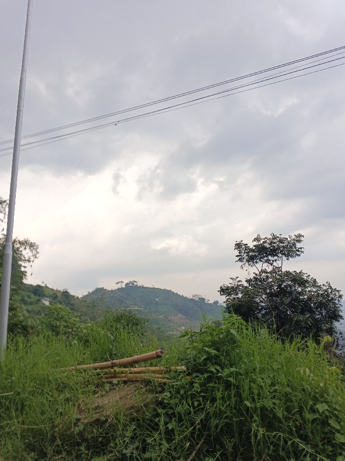 The image displays a rural, hilly landscape in Xiulin, Taiwan, under an overcast sky. The upper portion reveals a predominantly grey and white cloudy sky, traversed by three taut, dark utility lines extending horizontally from the left. A light-colored utility pole stands vertically on the far left edge of the frame. The foreground is densely covered with vibrant green, tall grass and various bushy vegetation. Several light brown, segmented bamboo poles lie horizontally on the ground amidst this foliage, slightly left of the image center. The midground consists of multiple undulating hills, extensively covered in lush green trees and vegetation, with evidence of terraced cultivation visible on their slopes. A large, dark green tree with dense foliage occupies the right midground. Distant structures appear faintly on the hillsides. No individuals, discernible actions, or interactions are present within the scene.