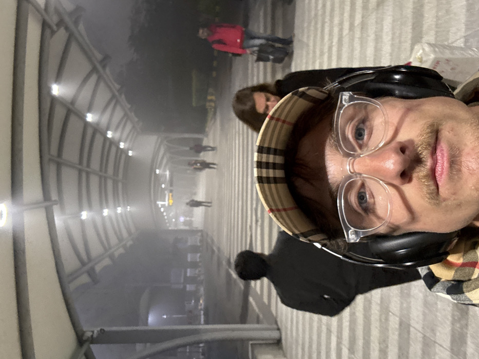 A selfie shows a person wearing glasses, headphones, and a patterned bucket hat. Other people are visible in the background, some walking in a tunnel-like structure with lights. The overall scene appears foggy or hazy. The photo seems to be taken at dusk or night.