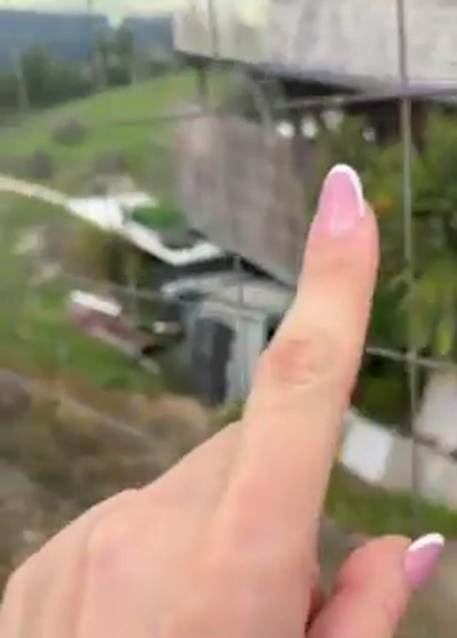 A woman's hand with manicured nails is shown reaching towards a metal fence. The camera then pans up and to the right, revealing a panoramic view of a green, hilly landscape with some buildings and a road visible in the distance. The sky is overcast with patches of blue. A bare tree is visible on the left side of the frame.
