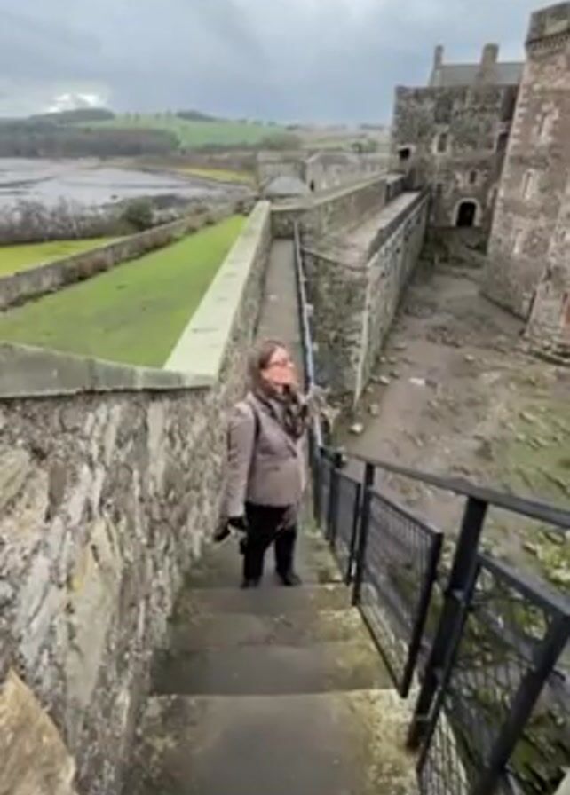 woman standing on a stone staircase in an old stone castle. She is wearing a beige jacket, black pants, a scarf, and sunglasses. She has brown hair and is smiling. The staircase is surrounded by stone walls and metal railings. In the background, there is a green field, a body of water, and a cloudy sky. The woman says that "Outlander" was filmed here. She then starts walking down the stairs.