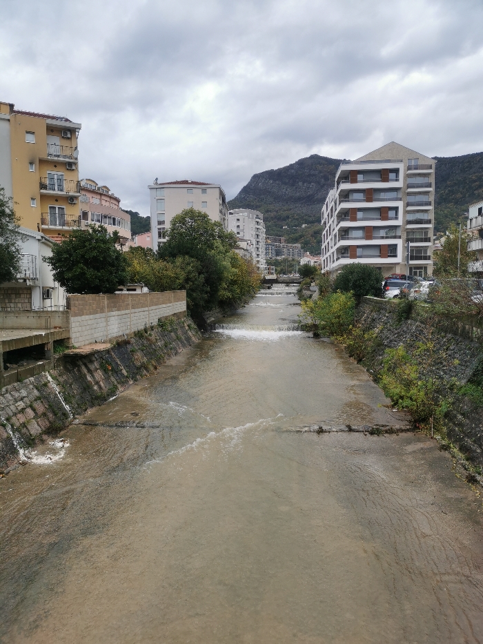 The image displays an urban scene within Budva, Montenegro, centered on a concrete-lined river or canal flowing under a heavily overcast sky