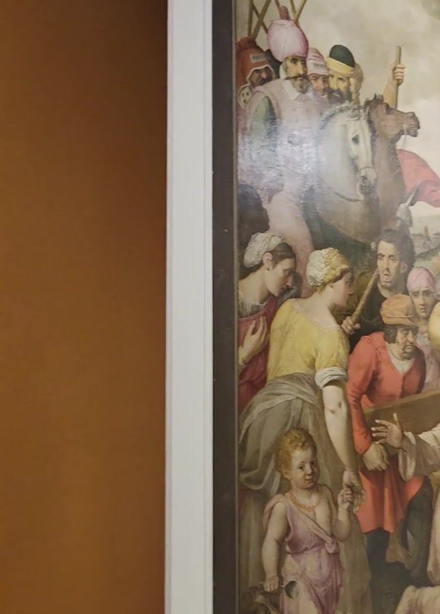 close-up view of two paintings on a wall. Initially, the view focuses on a painting depicting a scene with numerous figures, including a man kneeling and carrying a cross. The camera then slowly moves to reveal a second painting to the side. This painting shows a woman holding a baby, positioned in front of a draped curtain and a classical column. The wall is painted in neutral colors.