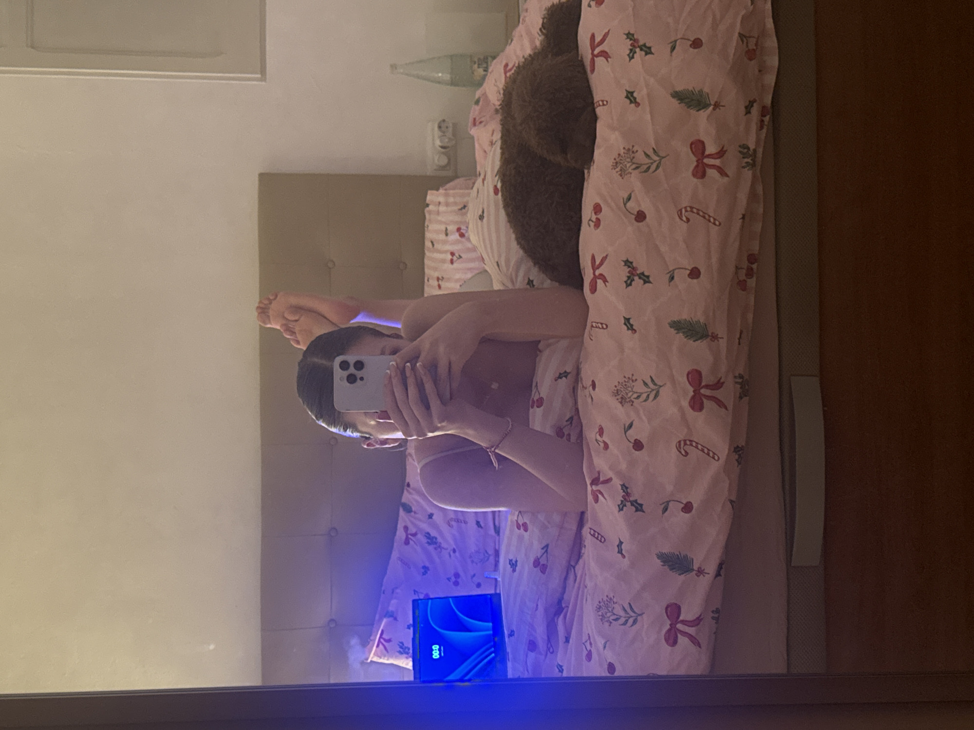 The image depicts an indoor scene within L'hospitalet De Llobregat, Spain, captured as a mirror reflection. A person, identified as female, is positioned prone on a bed with their head turned slightly left, obscured by a light-colored smartphone held in both hands, actively taking a mirror selfie. Their bare feet are bent upwards, soles facing the background. A light-colored bracelet is visible on their right wrist. The bed features a light brown upholstered headboard and is covered with pink bedding patterned with cherries, bows, candy canes, and botanical elements. To the person's left, an open laptop rests on a pillow, emitting a blue glow from its screen which displays "00:00". To the person's right, a dark brown, curly-haired small dog lies curled up on the bed. In the background, a light-colored wall is visible, featuring an electrical outlet and a glass bottle containing liquid. The scene is illuminated by warm, dim lighting, supplemented by the laptop's blue screen light.