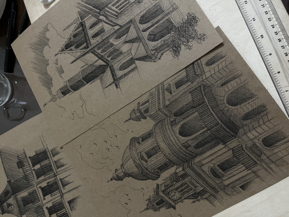 This image, captured in Vagharshapat, Armenia, depicts an artist's workspace from an overhead, slightly angled perspective. Three pieces of brown kraft paper, each featuring intricate black ink architectural drawings, are arranged on a light-colored wooden surface. In the foreground-left, one drawing illustrates a multi-tiered, domed building in a classical or baroque style, characterized by a prominent clock tower, arched windows, and balustraded balconies. Multiple small bird silhouettes are sketched in the sky above this structure. To the right, a second drawing showcases a tall Gothic-style cathedral with a slender spire, pointed arches, and buttresses; stylized clouds are depicted in the sky, and dense scribbled lines are present near its base. A third, partially obscured drawing in the upper-left features a multi-story building with balconies, rendered with a reflection beneath it, suggesting a body of water. Ancillary objects include a transparent ruler with black markings, positioned horizontally across the lower right frame, and a clear glass mug and a black fine-liner pen, both visible in the blurred background. No people are present.