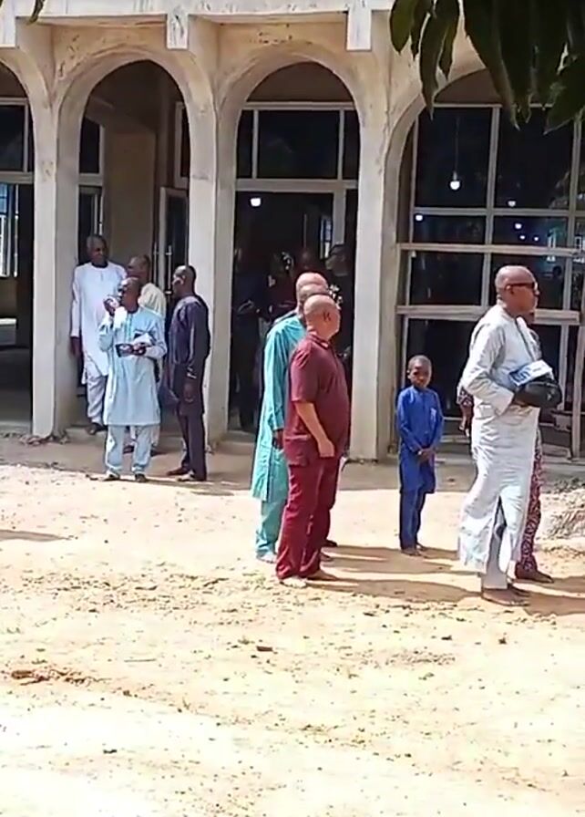 A group of people are standing outside a building. The building has a series of arches. The people are diverse in age and attire. There is a child in a blue suit. The ground is dirt and sand. There is a tree on the left side of the frame.
