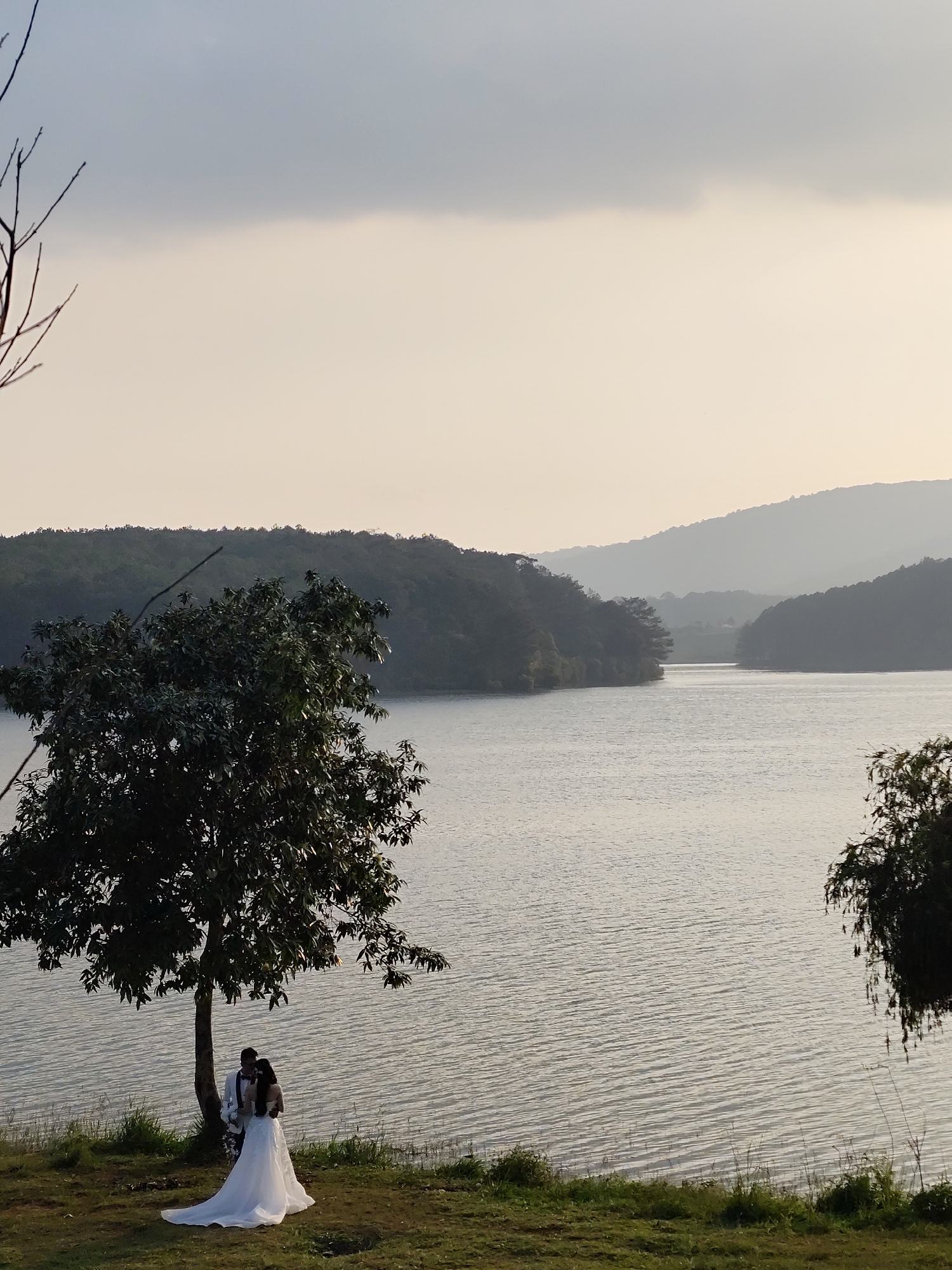 The image displays a wedding couple on the grassy bank of Tuyen Lam Lake in Da Lat, Vietnam, under a hazy, overcast sky. A large, dark-leafed tree stands prominently over the couple in the lower-center. The woman wears a long, white, strapless wedding gown with a train extending on the grass; she holds a white floral bouquet in her left hand and faces the man. The man, dressed in a dark suit and white shirt, stands beside her with his arm around her. The calm lake, showing gentle ripples, occupies the mid-ground, bordered by multiple layers of dark, forested hills that recede into the distant haze. Bare tree branches are visible in the upper-left corner of the frame.