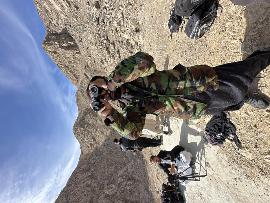 The scene depicts an arid, mountainous outdoor environment near Quetta, Pakistan. In the foreground, a man with a dark beard, wearing a camouflage jacket over dark attire, stands facing right, holding black binoculars to his eyes, observing the distant landscape. To his immediate left and slightly behind him, a second man in a black suit jacket over a white shalwar kameez is crouched, operating a black video camera mounted on a white tripod. Further in the background, another man in a black jacket and dark trousers walks away from the camera, and additional figures in traditional clothing are visible. On the ground near the camera operator are several black backpacks and bundles of dark clothing. The environment consists of steep, rocky, light-brown mountains with minimal vegetation under a clear blue sky with scattered white clouds.